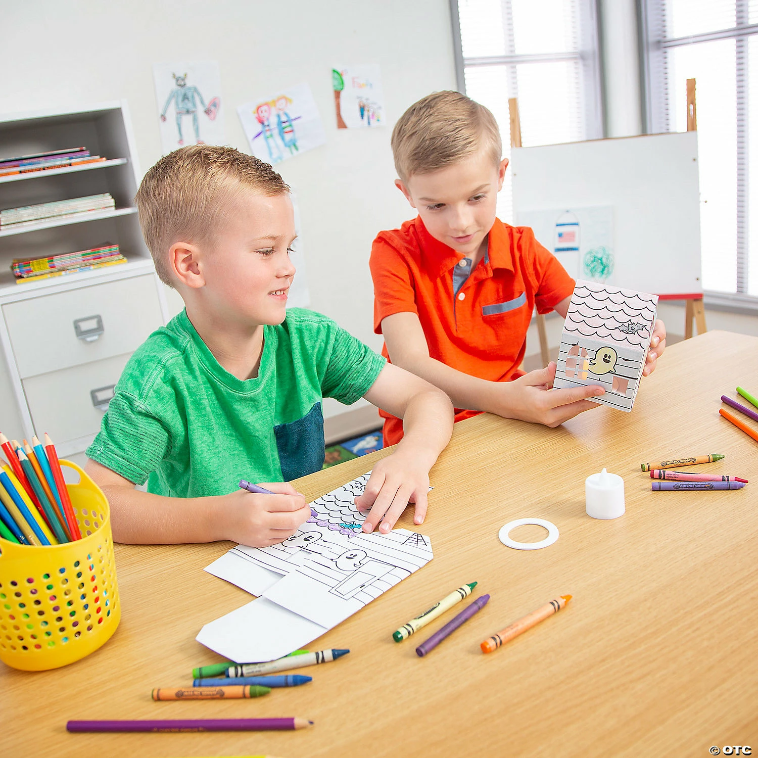 With just a flick of a little light, this coloring craft will bring delight! Kids will have a blast watching this haunted house come to life as they color and assemble it. Itβs a great classroom or Halloween party activity that kids can take home and use as a frightfully fun decoration. Includes battery-operated tea lights. Cardstock. 3 1/2″ x 3 1/2″ x 4 3/4″ Makes 12. All craft kit pieces are pre-packaged for individual use. Kits include instructions. Includes batteries. Simple assembly required. Β© OTCColor Your Own Haunted House Luminary Instructions