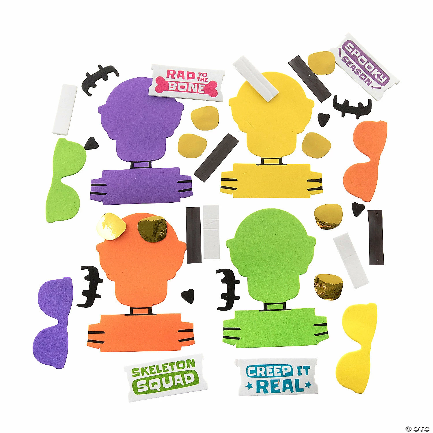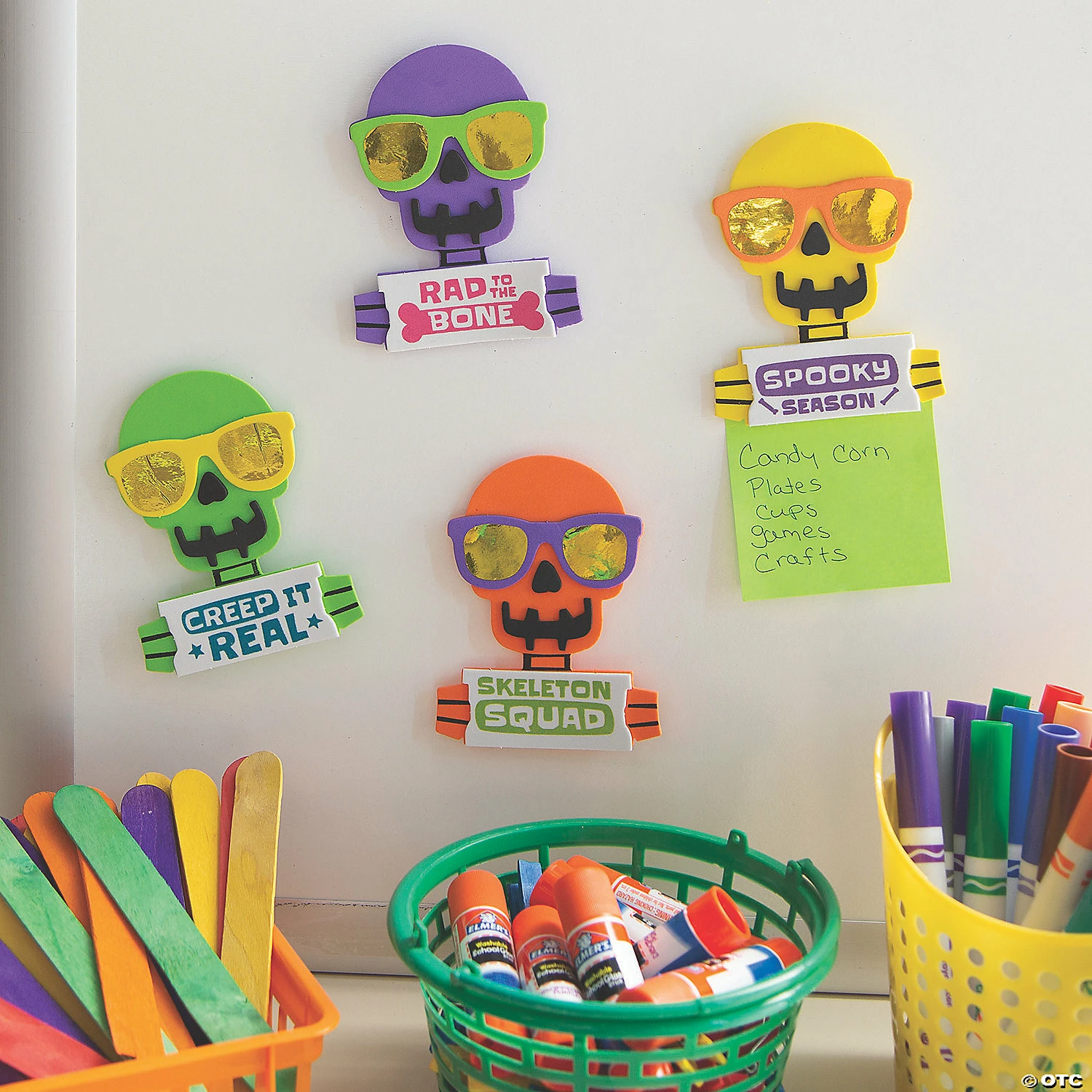 No shade, but these sunglasses-wearing skull Halloween magnet craft activities are rad to the bone and plan to stick around the joint a while. Kids can create their skeleton magnet projects at the class Halloween party, then take them home as a Halloween decoration party favor, or as an art supply to hang up their other Halloween art. Includes self-adhesive foam pieces and foil stickers. 3 1/4″ x 4 1/4″ Makes 12. All craft kit pieces are pre-packaged for individual use. Magnets are packaged separately. Do not discard. Kits include instructions. Β© OTC